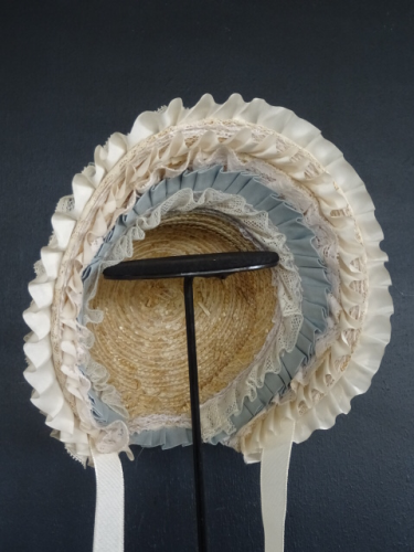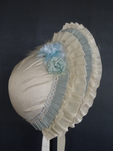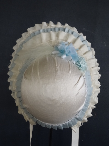 Correspond à une taille de poupée 7-8 , c'est à dire 28-30 cm de tour de tête. Joliment décoré avec fleurs et plumes.