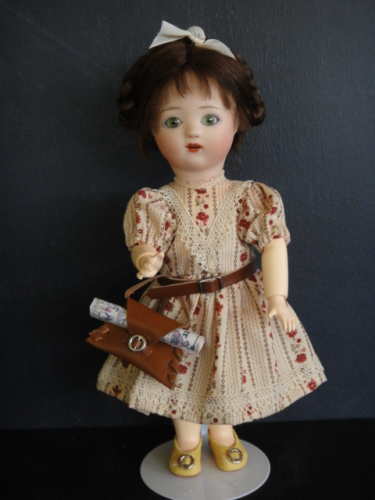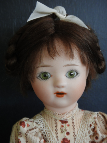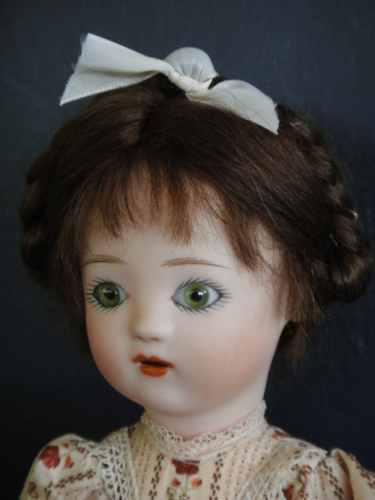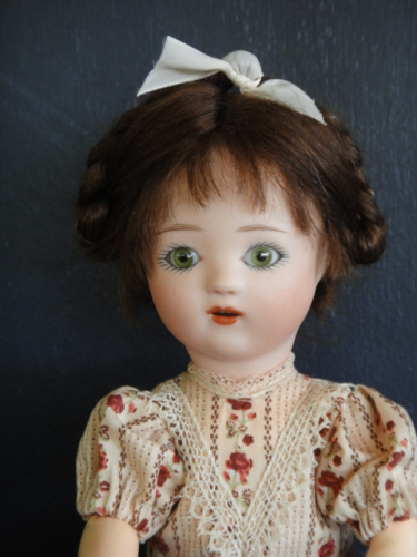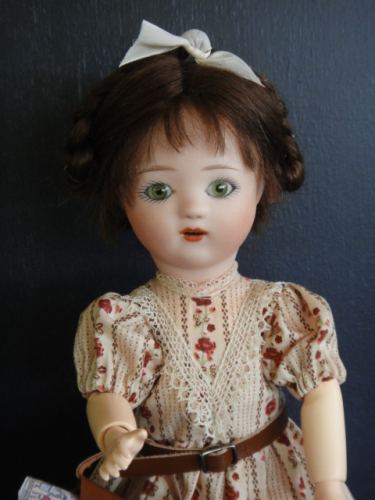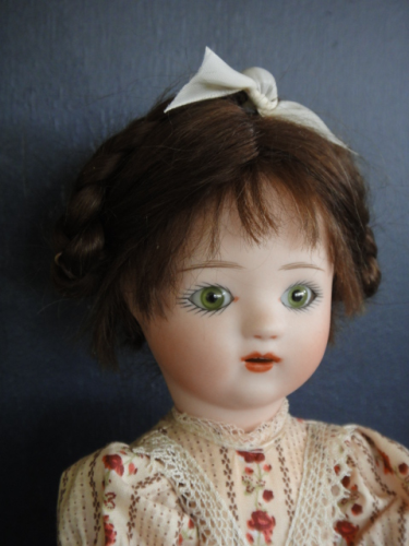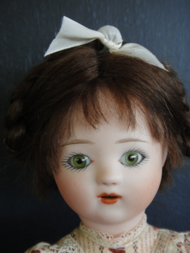 Poupée de 24cm, tête en porcelaine, yeux verts en verre.