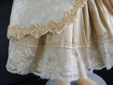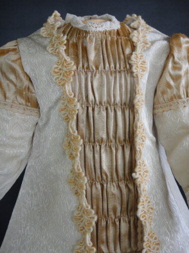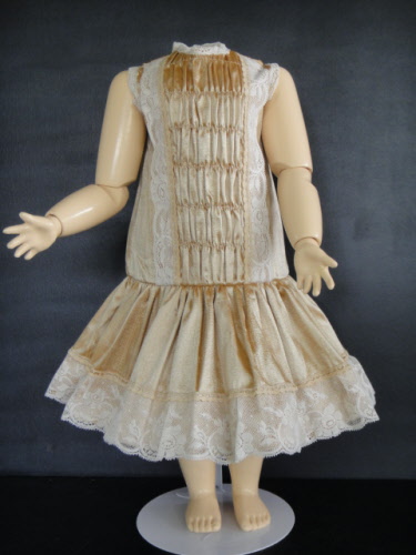 Robe en soie beige. Smocks dans le haut de la robe et superbes dentelles anciennes.Doublée d'un jupon en soie.