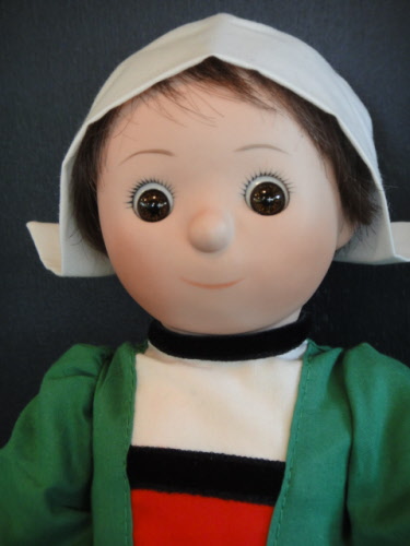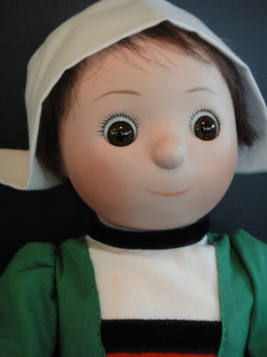 34 cm doll (13.3") , fine porcelain head from the original mold of  Georgette Bravot, brown glass eyes.   On the neck is written "Becassine",  GB (for Georgette Bravot) and the year of manufacturing.