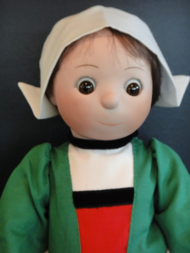 34 cm doll (13.3") , fine porcelain head from the original mold of  Georgette Bravot, brown glass eyes.   On the neck is written "Becassine",  GB (for Georgette Bravot) and the year of manufacturing.