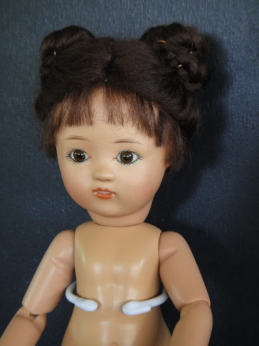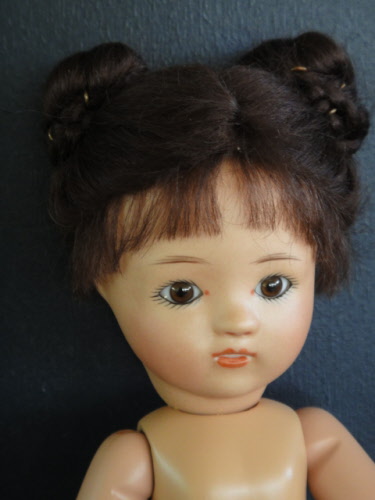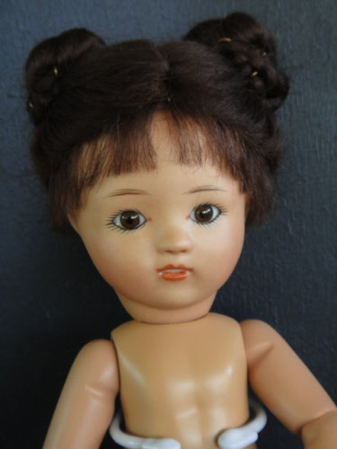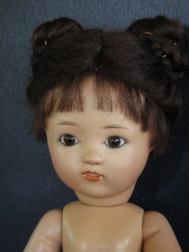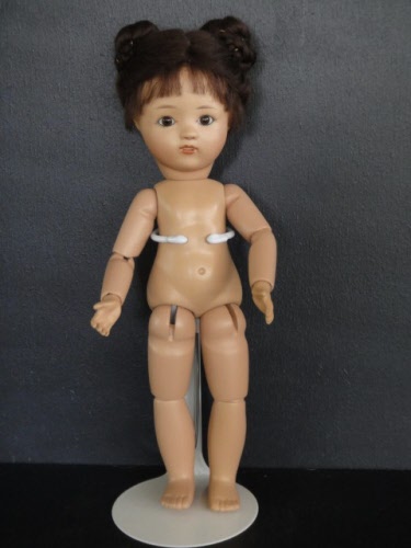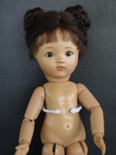 24 cm doll (9.5") , porcelain head from the original mold "Loulotte®" of Georgette Bravot, brown glass eyes. On the neck is written "Litou", GB (for Georgette Bravot) and the year of manufacturing.