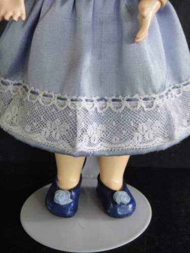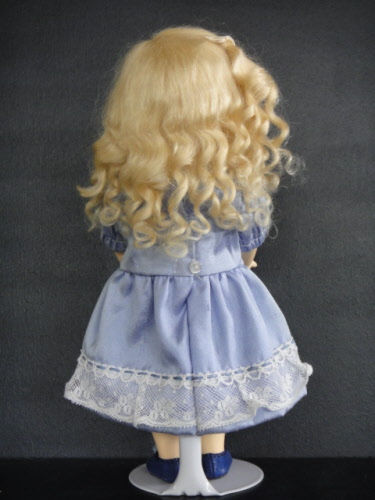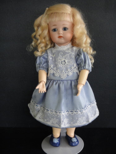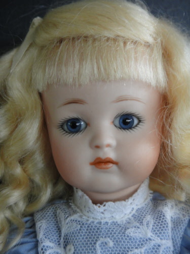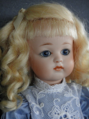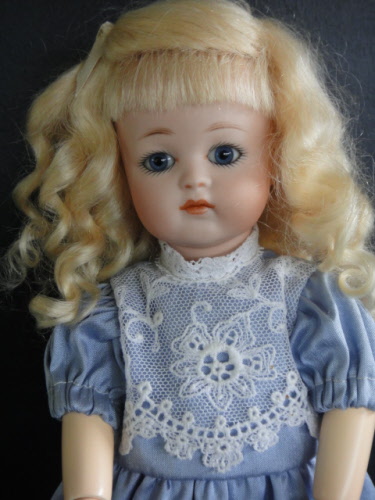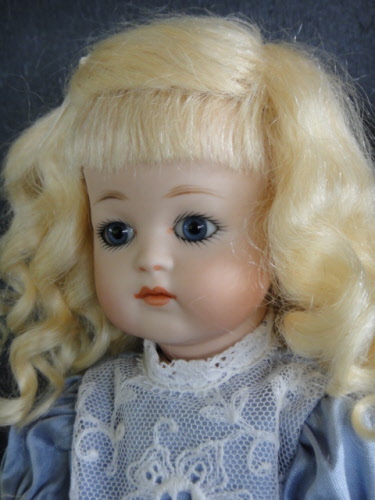 24 cm doll (9.5") , porcelain head from the original mold of J.D. Kestner, blue glass eyes. On the neck is written "Louisa ", GB (for Georgette Bravot) and the year of manufacturing.