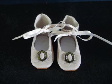 The decorations on the front of the shoes are antique bows, beads or buttons.