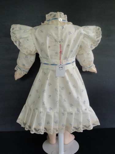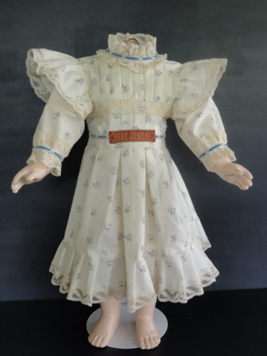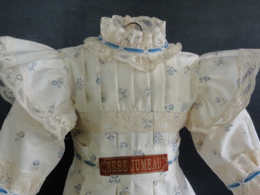 Reproduction du modèle Jumeau en tissu coton imprimé à fleurs bleues comme autrefois avec le label en soie"Bébé Jumeau".