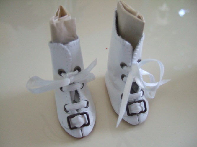 Petite boucle sur le dessus de la bottine. Fermée par un ruban de satin ou lacet en cuir.