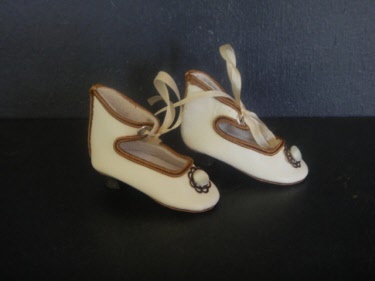 Toutes ces paires de chaussures, entièrement faites à la main, sont des modèles uniques réalisés avec des galons et ornements anciens. Ces différentes décorations sont collées avec soin sur le cuir (et non cousues).