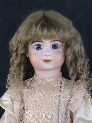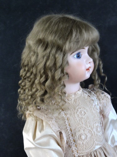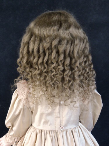 Perruque longue avec boucles, raie au milieu, avec frange.