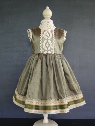 Robe en soie verte garnie de très jolies dentelles anciennes. Doublée d'un jupon en soie.