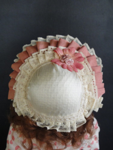 Chapeau pour poupée ancienne en soie et dentelles, joliment décoré avec plumes et fleurs.
