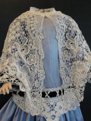 Robe taille basse en soie ancienne bleue garnie de superbes dentelles anciennes.