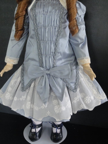 Superbe robe taille basse en soie ancienne bleue. Smocks dans le haut de la robe et gros ruban à la taille.