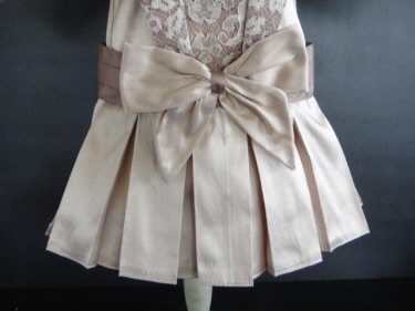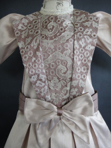 Dentelles anciennes dans le haut de la robe, très joli plissé dans le bas avec noeud en soie sur les hanches.