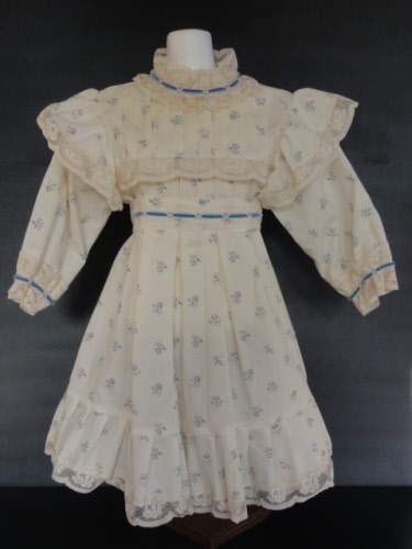 Robe taille haute en coton imprimé petites fleurs bleues. Reproduction de la robe "Jumeau".