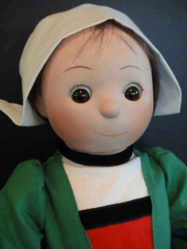 Tête en porcelaine peinte à la main. Yeux en verre marrons. Elle porte dans son cou le nom de "Bécassine", les initiales GB (Georgette BRAVOT) et la date de fabrication.
