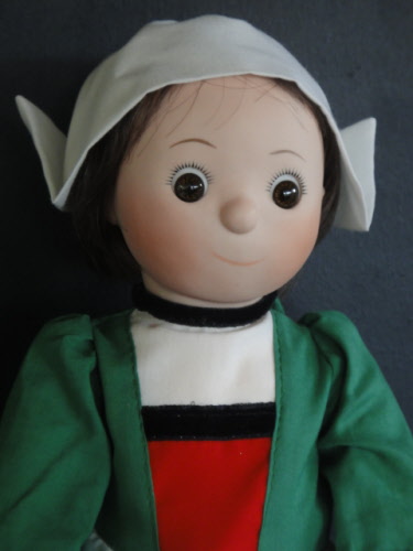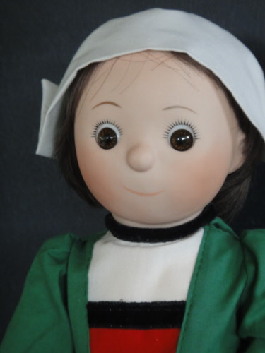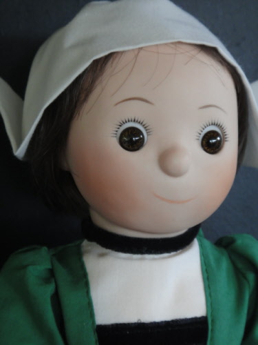 Tête en porcelaine peinte à la main. Yeux en verre marrons. Elle porte dans son cou le nom de "Bécassine", les initiales GB (Georgette BRAVOT) et la date de fabrication.