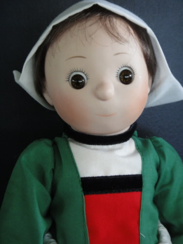 Tête en porcelaine peinte à la main. Yeux en verre marrons. Elle porte dans son cou le nom de "Bécassine", les initiales GB (Georgette BRAVOT) et la date de fabrication.