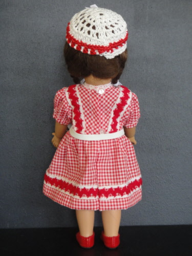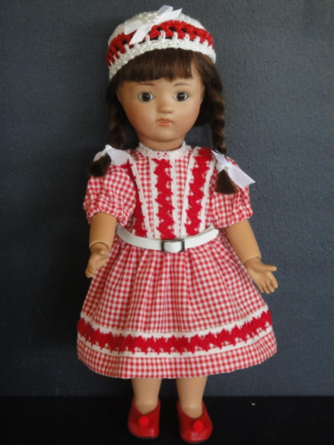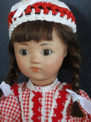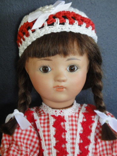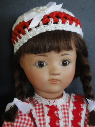 Poupée de 24cm, tête en porcelaine métis d'après le moule original Loulotte® de Georgette Bravot, yeux marrons en verre . Elle porte dans son cou le nom de "Litou ", les initiales GB (Georgette BRAVOT) et la date de fabrication.