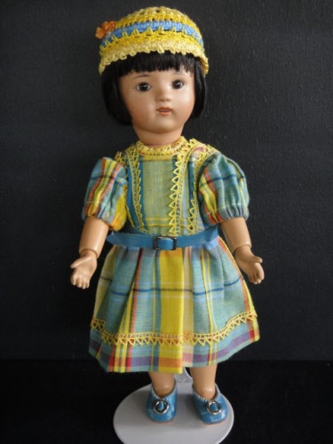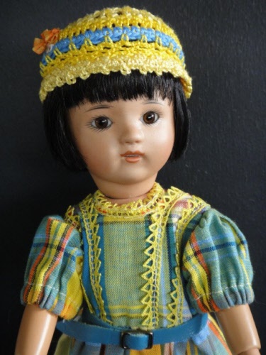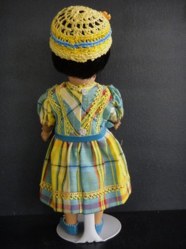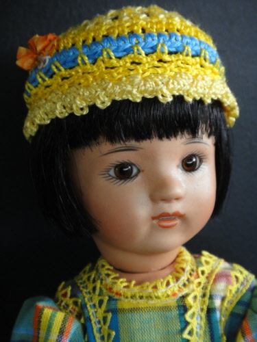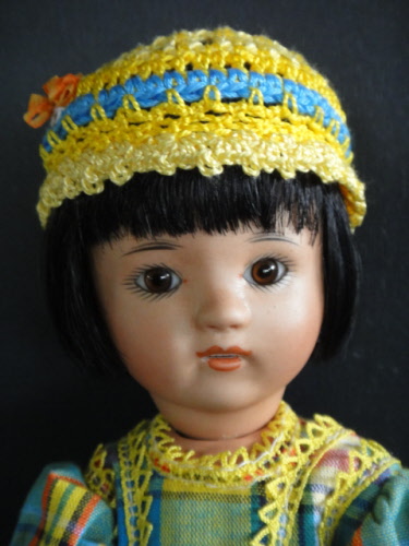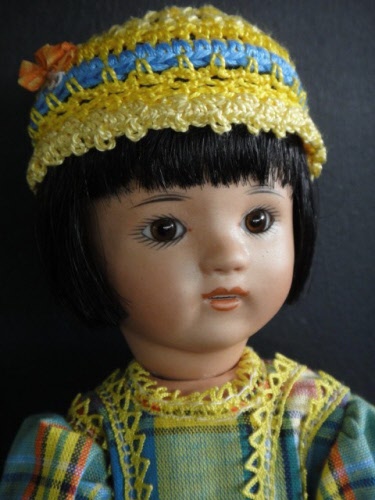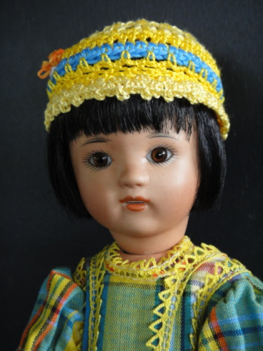 Poupée de 24cm, tête en porcelaine métis d'après le moule original Loulotte® de Georgette Bravot, yeux marrons en verre .