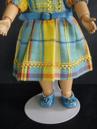 Robe et bonnet en coton, culotte en coton et chaussures en cuir.