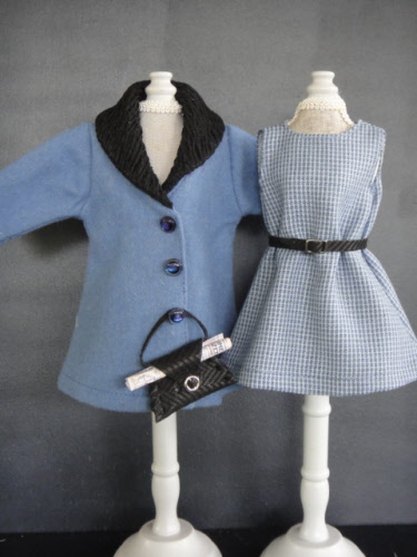 Robe assortie en lainage pied de poule bleu. Ceinture en cuir.