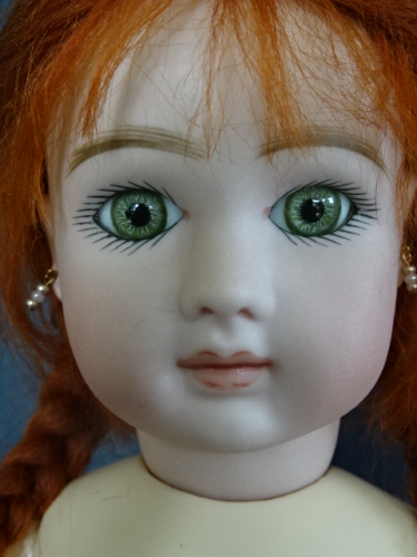 Tête en porcelaine magnifiquement peinte, yeux paperweight verts.