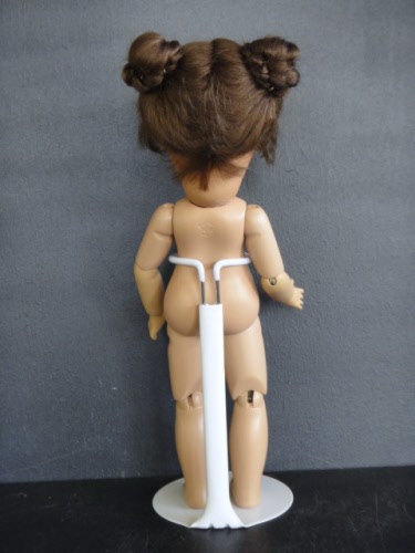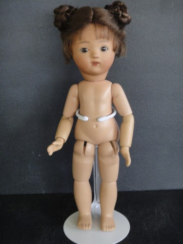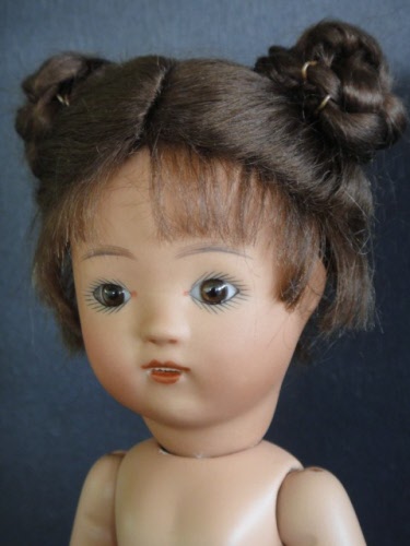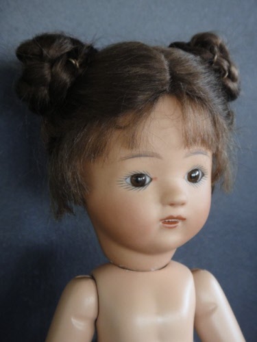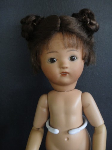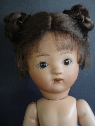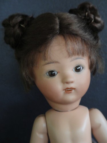 Poupée de 24 cm, tête en porcelaine métis d'après le moule original Loulotte® de Georgette Bravot, yeux marrons en verre.