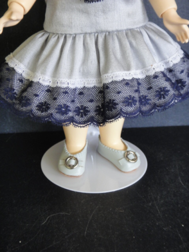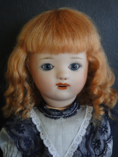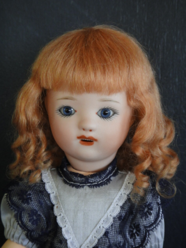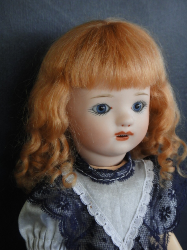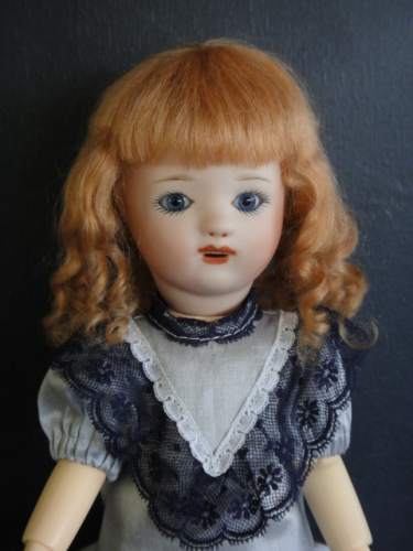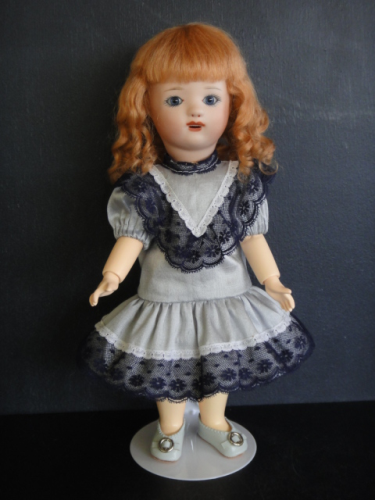Poupée de 24 cm, tête en porcelaine, yeux bleus en verre.