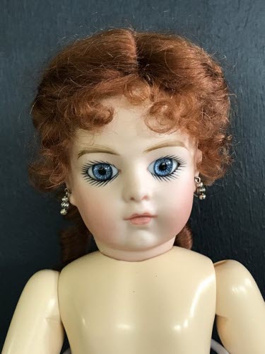Tête en porcelaine magnifiquement peinte, yeux paperweight bleus.