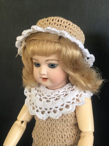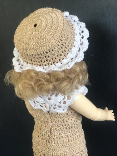 Cotton crochet dress, ecru and white color. Wonderful hat and bag. White socks and leather shoes.