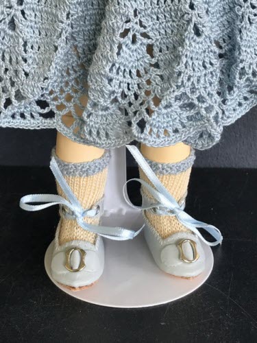 Cotton crochet dress, bleu color. Ecru socks and leather shoes.
