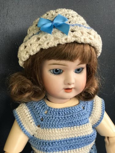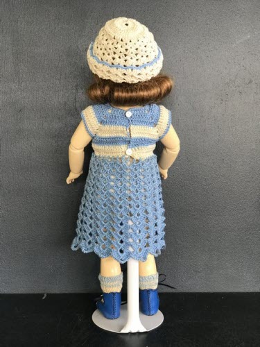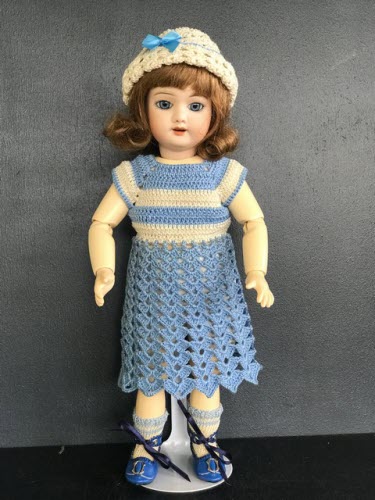 Cotton crochet dress, ecru and blue color. Wonderful hat . Ecru socks and leather shoes.