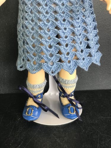 Robe crochetée main en coton écru et bleu. Chapeau assorti. Chaussettes écrues. Chaussures en cuir.