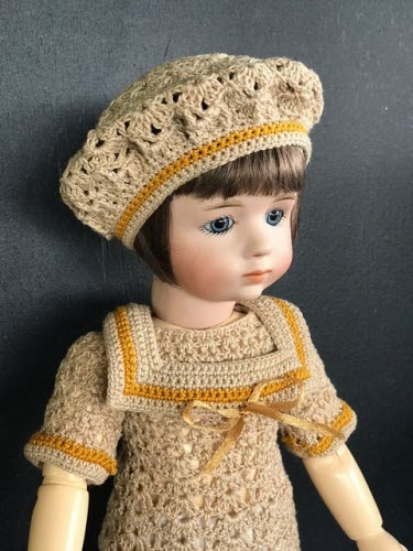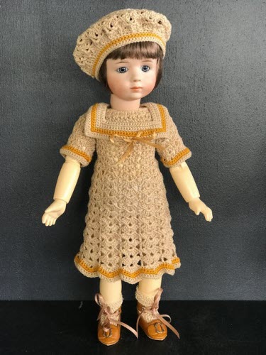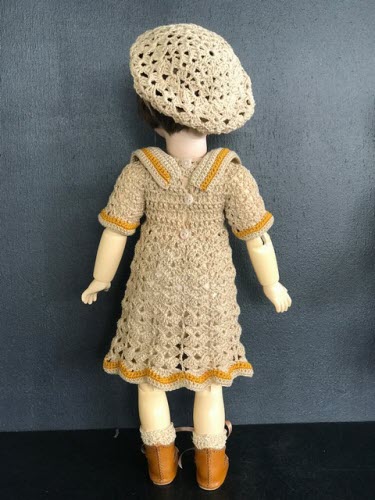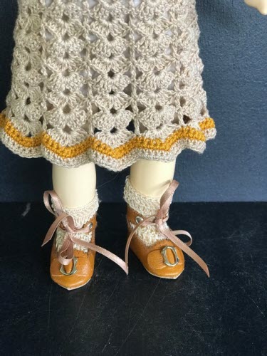 Robe crochetée main en coton beige. Chapeau assorti. Chaussettes beiges. Chaussures en cuir.