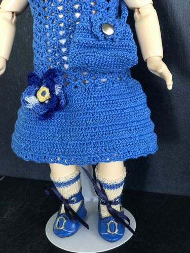 Robe crochetée main en coton bleu. Sac assorti. Chaussettes écrues. Chaussures en cuir.