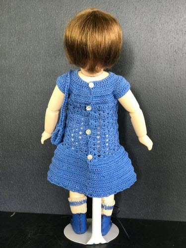 Cotton crochet dress, blue color. Wonderful bag. Ecru socks and leather shoes.