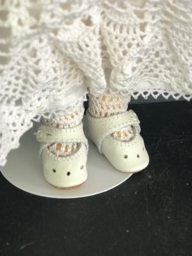Robe crochetée main en coton blanc. Chaussettes blanches. Chaussures en cuir.