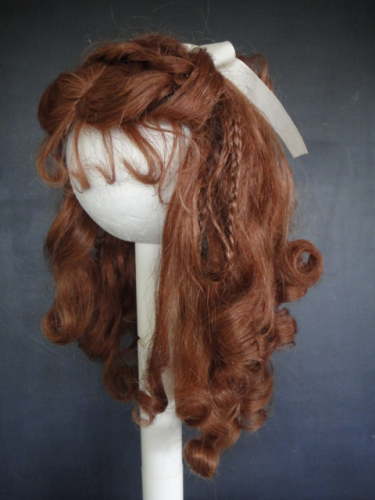 Perruque en cheveux 100% naturels, cheveux longs bouclés, natte sur le dessus de la tête, petites nattes sur les côtés, frange légère.