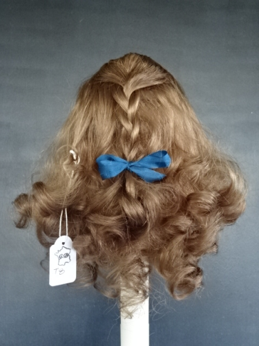 Perruque en cheveux 100% naturels, cheveux longs bouclés, avec frange et natte dans le dos.
