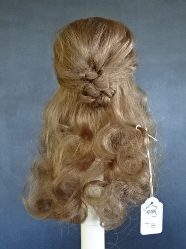 Perruque en cheveux 100% naturels, cheveux longs ondulés avec frange, noeud au dessus de la tête.