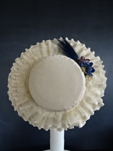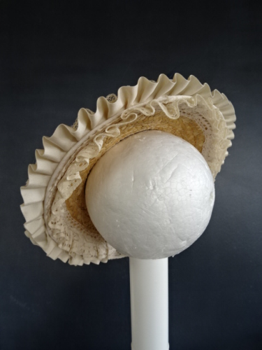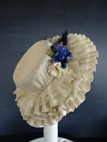 Correspond à une taille de poupée 5 à 6 , c'est à dire 25cm-26cm de tour de tête. Joliment décoré avec fleurs.