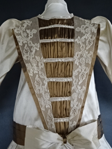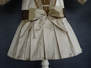 Robe taille basse réalisée dans un taffetas de soie ancien beige et marron.