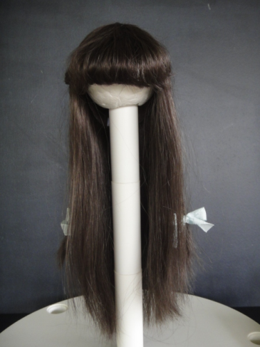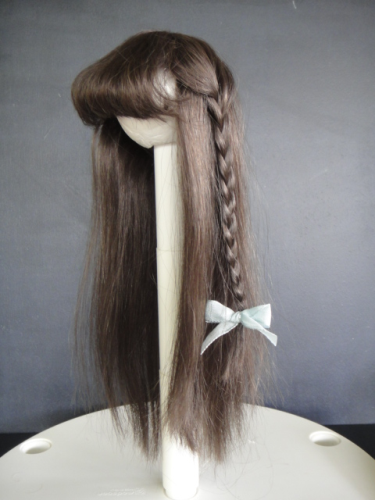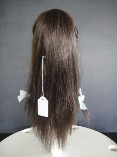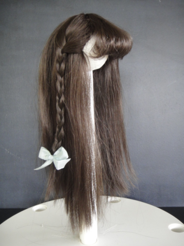 Perruque en cheveux 100% naturels, cheveux longs très raides, natte de chaque côté et frange.