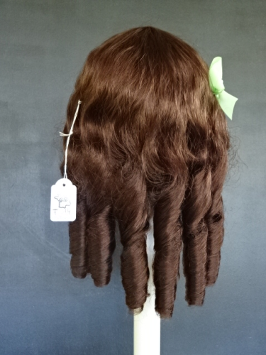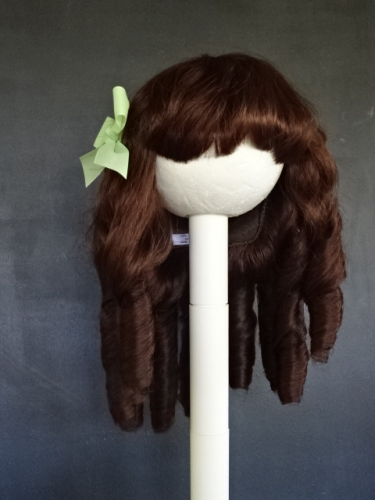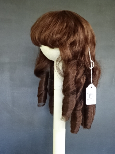 Perruque en cheveux 100% naturels, cheveux longs bouclés, noeud et frange.