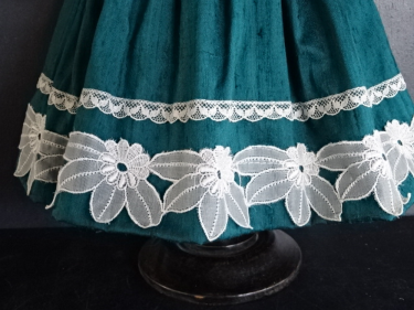 Robe taille haute réalisée dans une soie ancienne vert foncé.