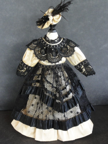 Robe réalisée dans une soie ancienne beige et garnie de dentelles anciennes noies.